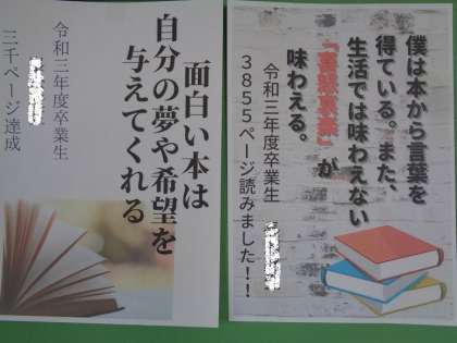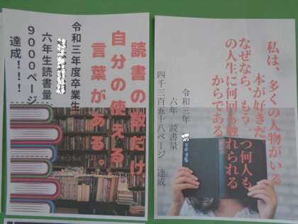 6年生は、「人生で一番読書する9ヶ月チャレンジ」のしめくくりとして、「自分にとって読書とは・・・」を語る名言をポスターにして後輩達にのこします。名言と今年度の読書実績が書かれたポスターは、来年度学校図書館に掲示予定です。