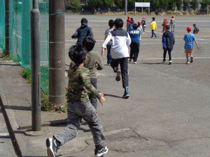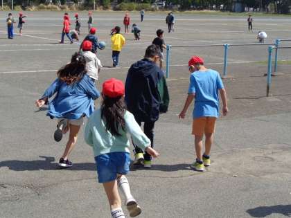 いい天気のサンタイム。新しいクラスの友達、先生と遊ぼうと元気いっぱいグラウンドに飛び出していく背中がすてきです。