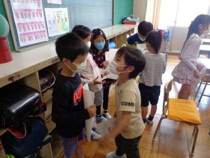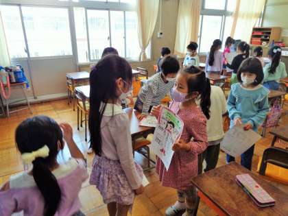 2年生はどこのクラスも自己紹介をしていました。こちらのクラスでは、友達に声をかけてカードを見せながら自分のことをお話ししました。「どっちも鬼ごっこがすきだね。」などと自分と友達を比べて話している姿が素晴らしいです。