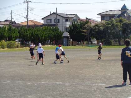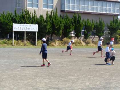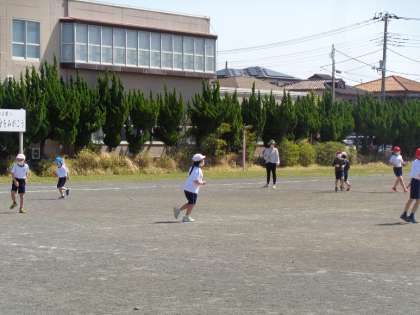 慣れ親しんだメンバーに1年生が加わったなかよし学級です。1・2組合同でおにごっこを楽しんでいます。思いっきり走り回って汗をかきました。