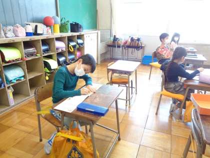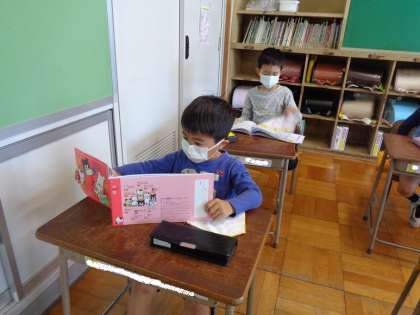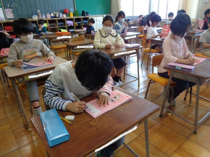 漢字ドリルが配られました。さっそく丁寧に名前を書き、中を開いて見ています。指で新しい漢字をなぞってみている子もいました。