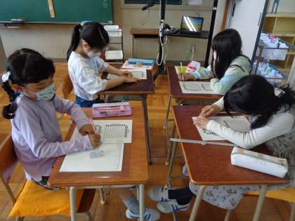 2年生で学習した九九の表をじっくり見て、秘密をみつけました。図を見ながら、気付いたことをどういう言葉で表現したら友達によく伝わるのか、頭を使っていました。