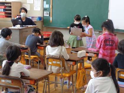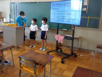 1年生の時の経験をもとに自分たちで朝の会や健康観察をしています。先生は近くで見守っています。