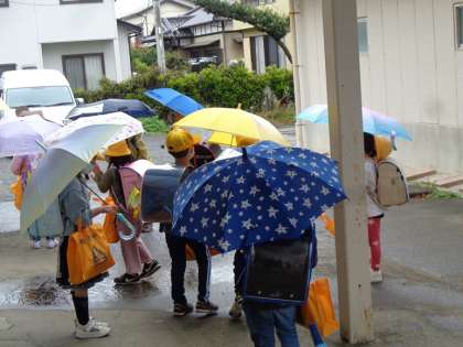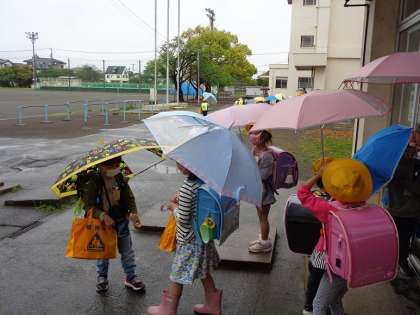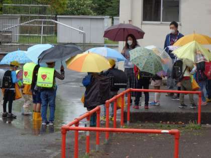 今日は雨降りなので、傘をさしての下校です。歩きにくいけれど、これも経験です。気をつけて帰ろう!