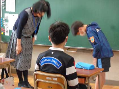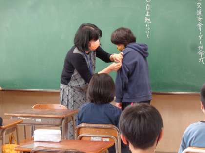 6年生が交通安全リーダー任命式で校長先生からリーダーワッペンを授与されました。校長先生の前でリーダーの誓いを立派に述べました。リーダーとして通学路の安全に関心を持ったり下級生に気を配ったりしながら、原小の交通安全を守ってほしいと思います。