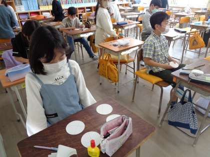 1年生を迎える会で1年生にプレゼントするブンブンゴマを作成中です。3年生の時に習得したコンパスの使い方を活用することができました。