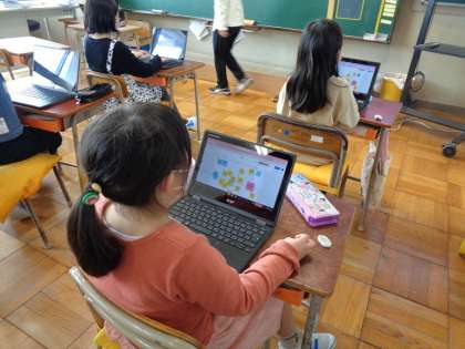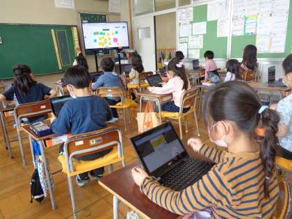 1年生を迎える会で1年生に伝えたいメッセージを各自で考えてジャムボードに書き込んでいます。みんなの考えを比べたり合わせたりしてクラスとして伝える言葉を決めていきます。