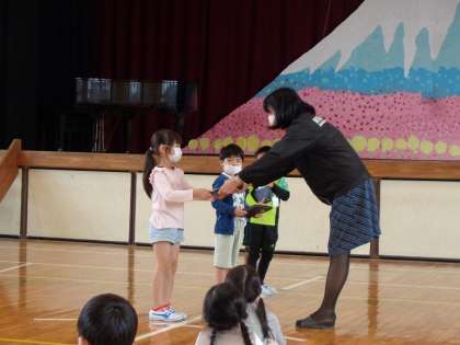 1年生がChromebookの貸与式を行いました。校長先生から、「大切に使うこと、Chromebookではできないこともあることを覚えておくこと、学習に役立てること」の3つのお話がありました。学級の代表児童が校長先生からChromebookを受け取りました。