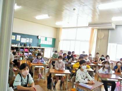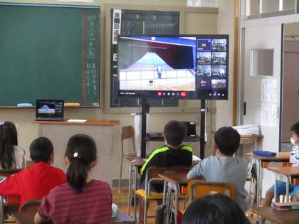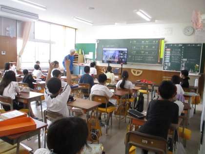 教室の様子です。体育館で6年生が出題するクイズに楽しそうに答えたり、拍手したり、盛り上がっています。クラスの代表が1年生にプレゼントを手渡した後、教室からもメッセージを送りました。