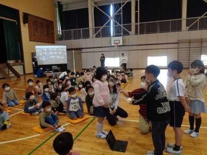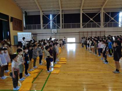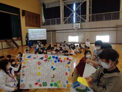 4年生からはブンブンゴマ、5年生からは教室掲示用の校歌が贈られました。会の終わりに校歌を歌いました。