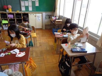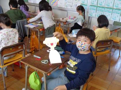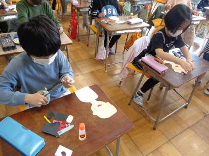 色画用紙を切って組み合わせて、自分の顔を作成中です。目の形や髪の毛などにこだわりが感じられる楽しい作品ができました。
