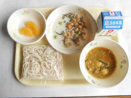 めん カレー南蛮 牛乳 ナッツと小魚のからあげ