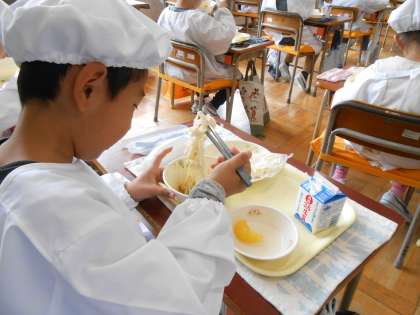 2枚目は1年生が給食ではじめて登場しためんをカレー南蛮の汁に