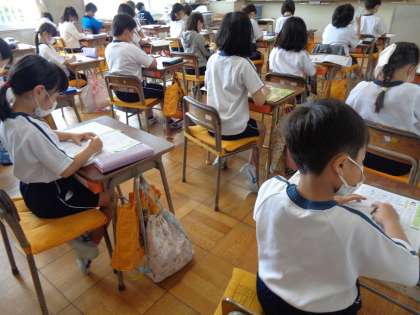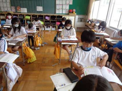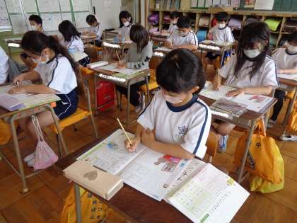 似ている文字を比較して、共通点と相違点を見つけながら、注意深く書きました。姿勢を整えてていねいに書く姿が立派です。