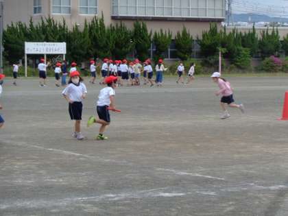 リレー大会に向けて練習中です。バトンパスがスムーズにできるようにがんばります。