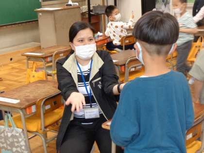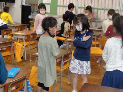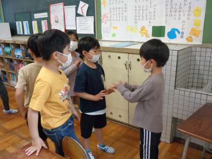 英語であいさつ。「Hello の歌」を友達とペアになってジェスチャーをつけて歌っています。
