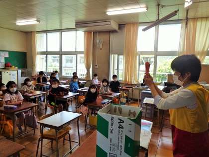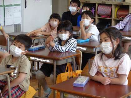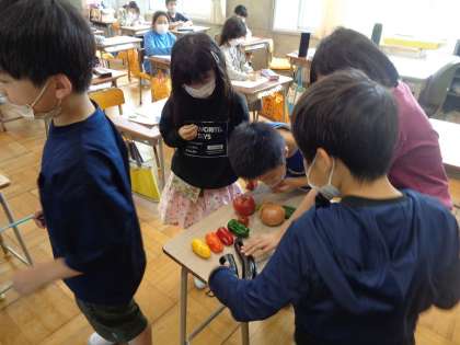 「目指せ!やさいはかせ」博士というのは、?を見つけてわかるまで調べる人です。今日は、はてなを見つける技を学習しました。野菜にくわしい給食の先生から野菜のお話を聞いて、もっと知りたいこと、これはどうなんだろう?と思うことが「はてな」になります。
