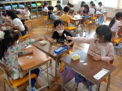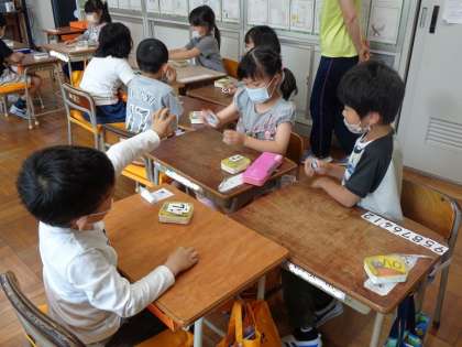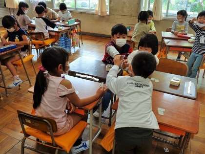 グループで数くらべをしています。表を見ないでえらんだカード、だれのが一番大きい数かな? 遊びながら数の大小を見分けれるようになっていきます。