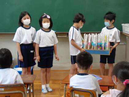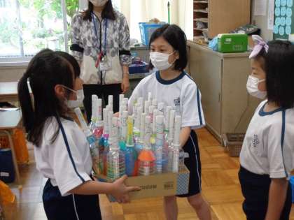 2年生が1年生のために作ったペットボトルじょうろを届けに行きました。お手紙も入っています。1年生はこのじょうろを使ってアサガオにお水をあげて育てます。