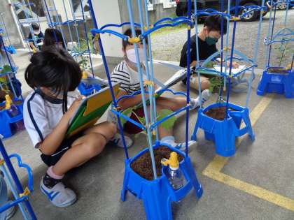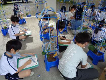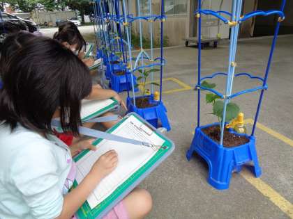 植えた後はしっかり観察。目で見て、手で触って、においもかいで、友達が選んだ野菜の苗とくらべっこして・・・。成長の様子を記録しながら育てていきます。
