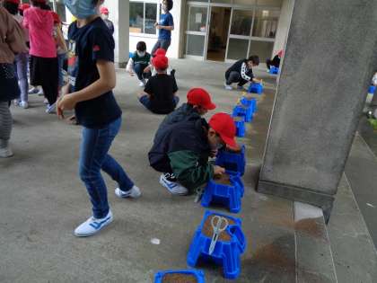 ダイズ、ヒマワリ、オクラ、ホウセンカの種をまきました。いろいろな植物の育ち方を比べながら観察します。