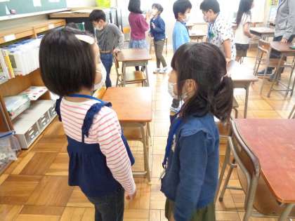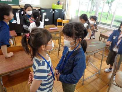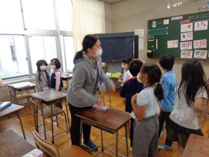 「How old are you?」「I'm seven.」年齢を聞く会話に挑戦しています。