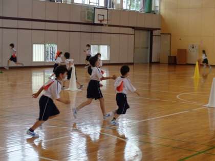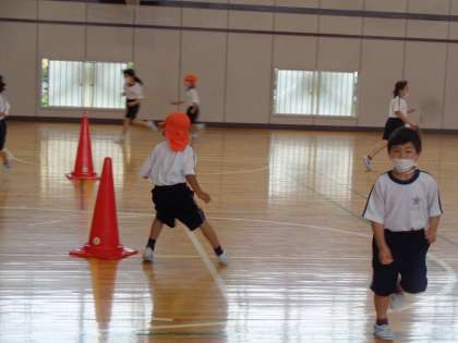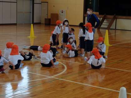 おにあそびで思いっきり走り回りました。「集合」の合図で担任の先生の回りに集まったときにはへとへとです。