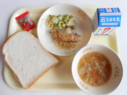 食パン 牛乳 イチゴジャム 鶏肉の香草パン粉焼き