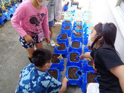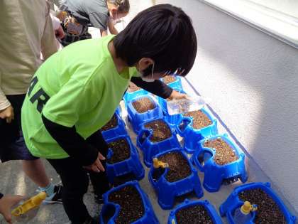 先週まいた種が発芽しました。「見て見て芽が出たよ!」と指さして教えてくれました。