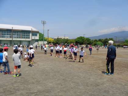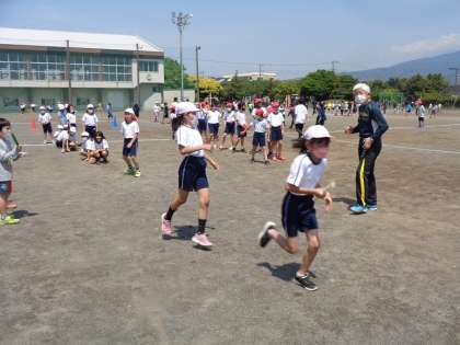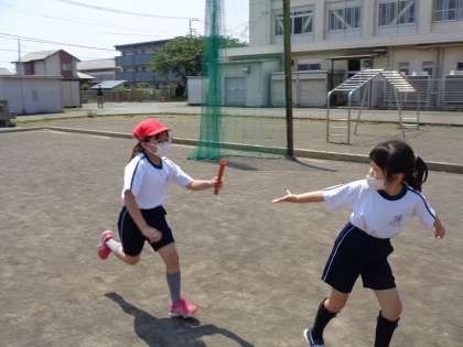 サンタイムのグラウンドの様子です。リレー大会に向けてのグラウンド使用割り振りに従って、クラスごと練習しています。バトンパスに熱が入っているのは、4年生と6年生です。