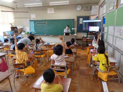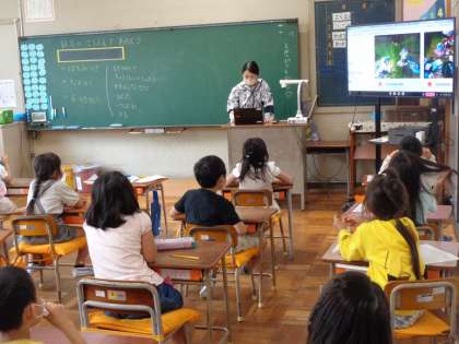 昨日の校外学習で見つけてきた物を思い出していました。先生が撮ってきた写真を見ながら、見たものや遊んだことをお話ししました。