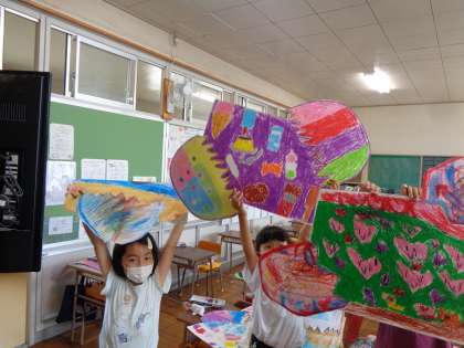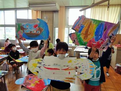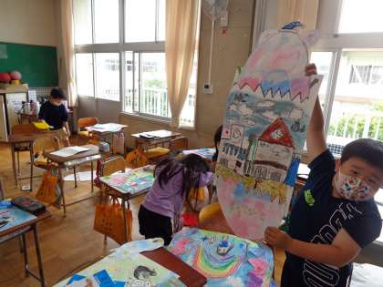 「完成したよ!」と見せてくれました。「不思議なたまご」からいろいろな世界が飛び出しています。