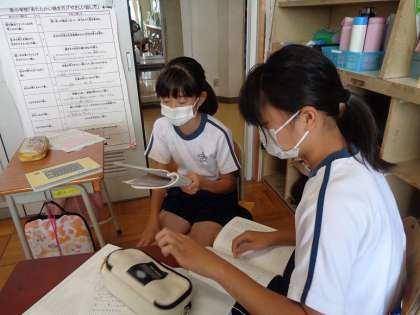 同じ6年生が書いた作文から表現の工夫を見つけて、その効果を話し合っています。見つけたことを自分の作文にいかします。