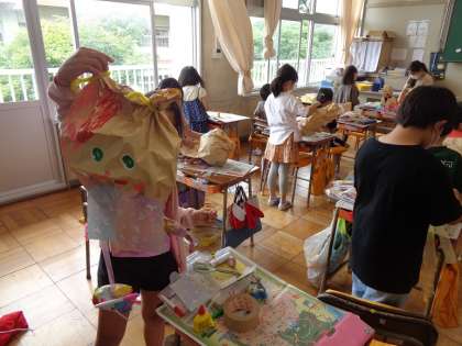 「くしゅくしゅぎゅ」紙袋が楽しい立体作品に変身しました。