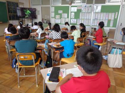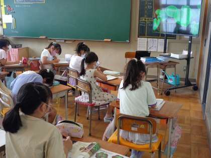 植物の生長の仕方を動画で確認しています。動画を見たり聞いたりしながらノートにメモをとる姿が立派です。