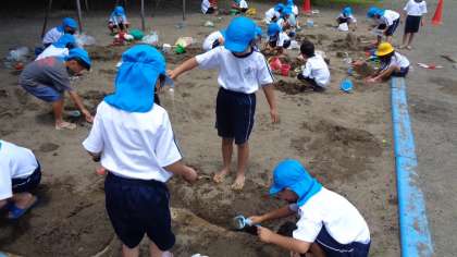 「砂や土となかよし」山を作ったり、川を作って友達とつなげたり、川に水を流してみたり・・・自然に友達と関わっていきます。