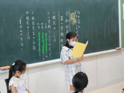 1学期の終業式を行いました。2年生、4年生、6年生の代表児童が、1学期のふり返りや2学期の抱負について発表しました。「がんばることは気持ちいい」「がんばることで友達との絆が深まる」素晴らしいことを学んだ1学期でした。
