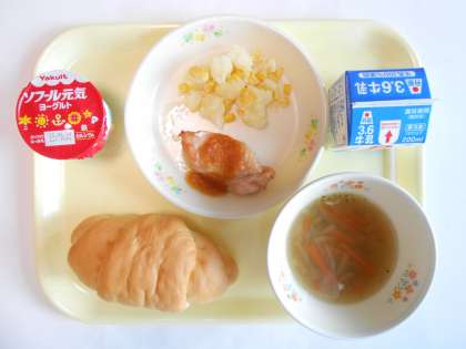 バターロール型パン 牛乳 鶏肉のバーベキューソース コーンポテト