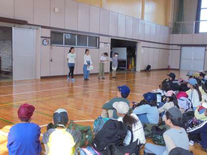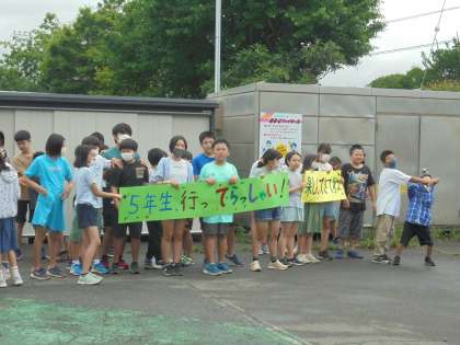 5年生の子どもたちが、体育館に荷物を持って集まり、出発式を行いました。少し日差しが見え隠れする中、体育館に「いってきます。」の元気な声が響き渡りました。6年生が、「楽しんできてね。」の幕ををかかげてお見送りしました。山の天気は悪いかもしれませんが、5年生のパワーで吹き飛ばして楽しんでほしいです。