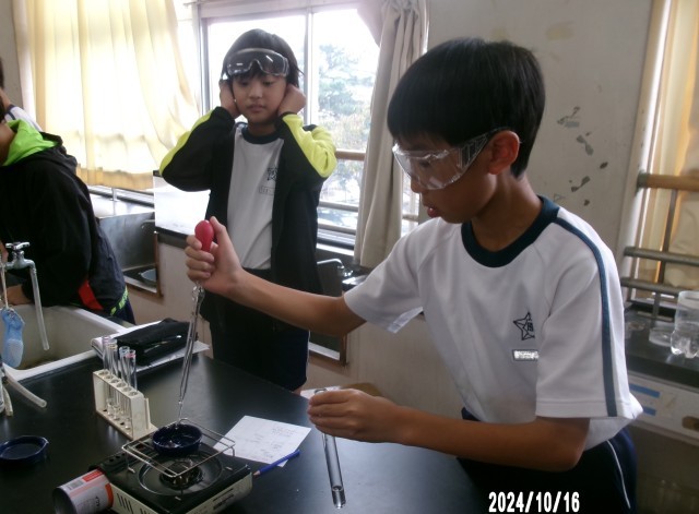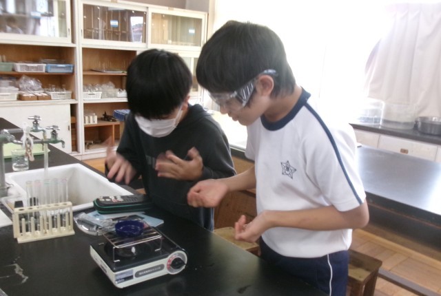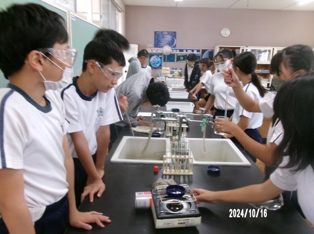 6年3組の理科「水よう液の性質」の様子です。食塩水、炭酸水、アンモニア水、塩酸、石灰水の無色透明な水溶液5種類を、水分を蒸発させたり。においをかいだりして違いを見つけています。