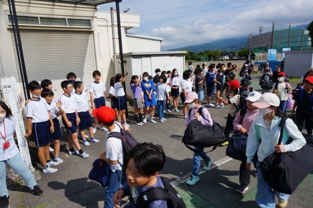 5年生は、今日から1泊で桃沢少年自然の家に出かけます。外はすでに暑いですがが、元気な顔で出発しました。6年生や保護者の方もお見送りに出てくれました。安全で楽しく過ごせるといいね!「いってらしゃい!」