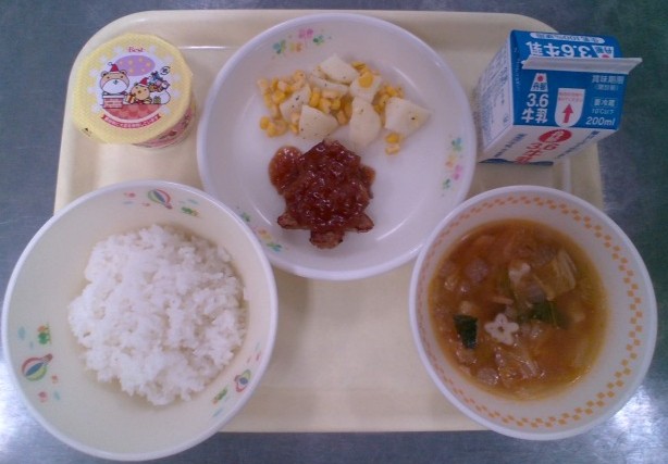 ごはん 牛乳 もみの木ハンバーグ コーンポテト ミネストローネスープ クリスマスカップデザート