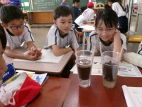 4年2組の理科「雨水のゆくえ」の授業の様子です。運動場の砂を拾ってきて水のしみこ...