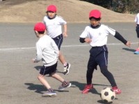 4年2組の体育「サッカー型ゲーム」の様子です。ボールを持っている味方に対し、どこ...