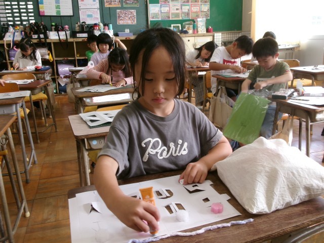 2年1組の図工「まどをあけたら」の様子です。カッターを上手に使って窓を作っていま...