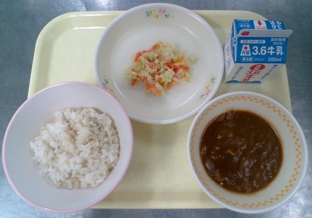 ごはん ハヤシライス 牛乳 コールスローサラダ原小の給食室は、外から中の様子を見...