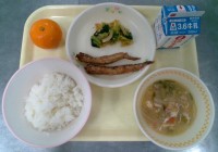 ごはん 牛乳 ししゃもの竜田揚げ おひたし 鶏肉と野菜のみそ汁 みかん教室からの...