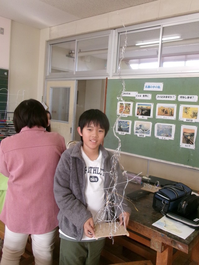 5年2組の図工の授業の様子です。針金を曲げたりつなげたりして作品を作っています。...