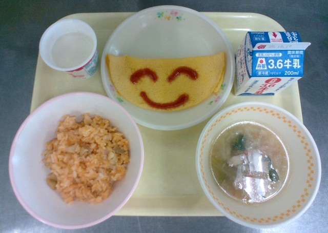 オムライス(チキンライス・たまご・ケチャップソース) 牛乳 キャベツのスープ ヨ...