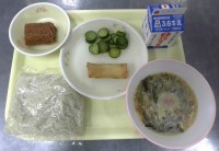 五目ラーメン 牛乳 春巻き きゅうりのピリからあえ 手作りミニココアケーキ教室か...